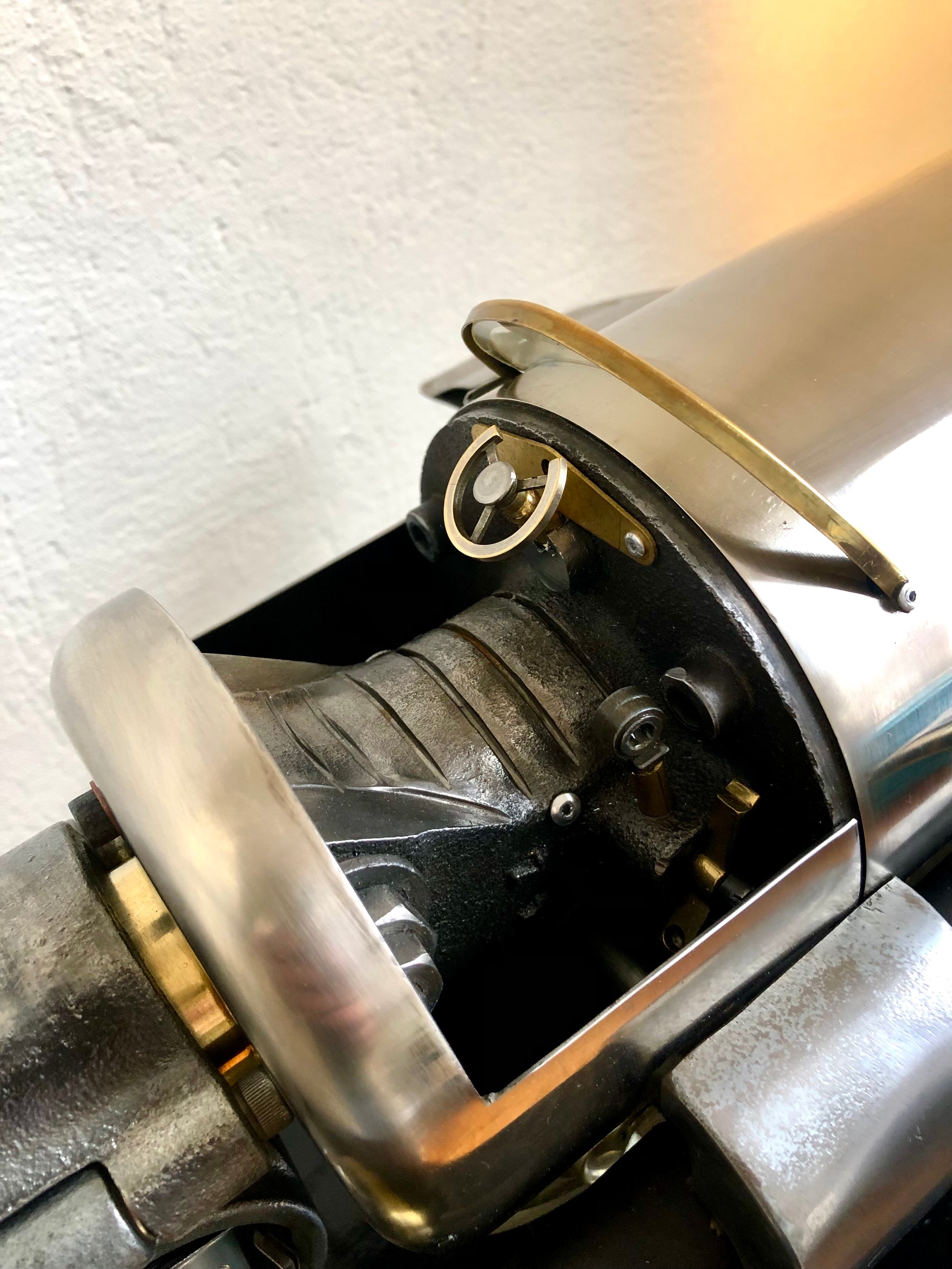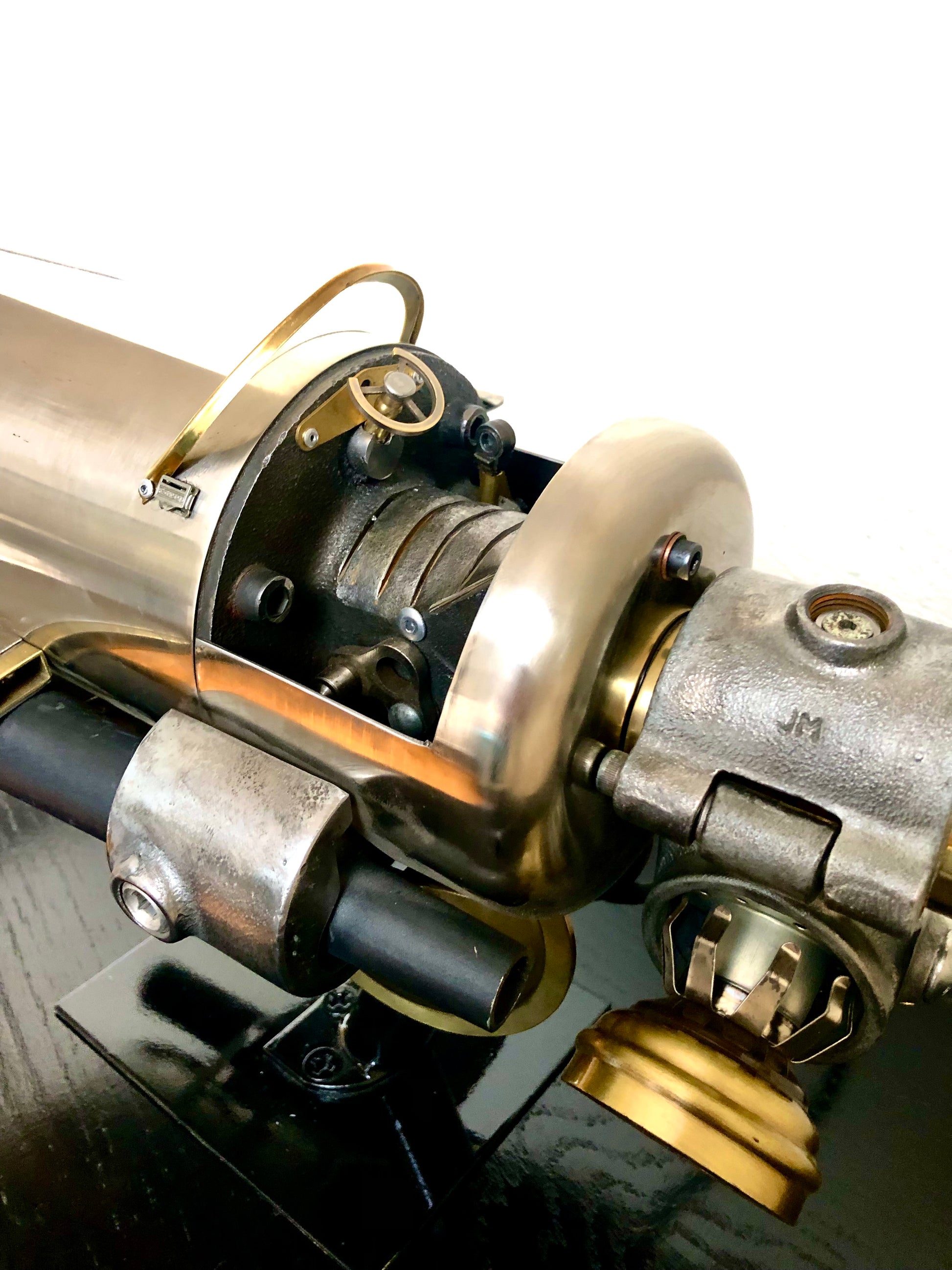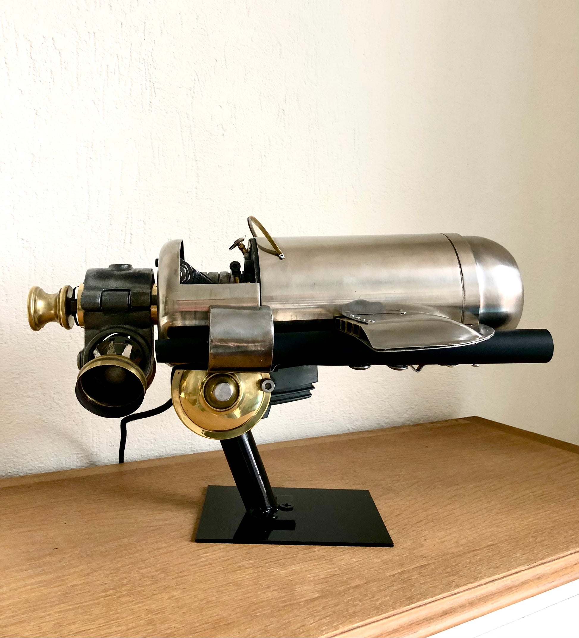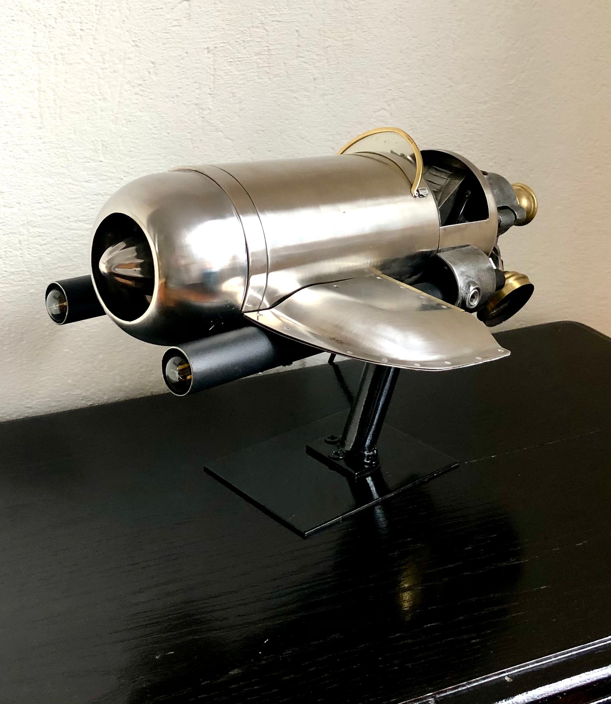 Speeder volledig vervaardigd uit metaal(RVS,gietijzer en messing). Dit uniek futuristisch model van een speeder met turbinemotor is gemaakt door Kristof Decuypere die reeds 10 jaar Metalen sculpturen maakt te Oostende en tegenwoordig in Brugge. Afmetingen 50/30/38, 17 kg