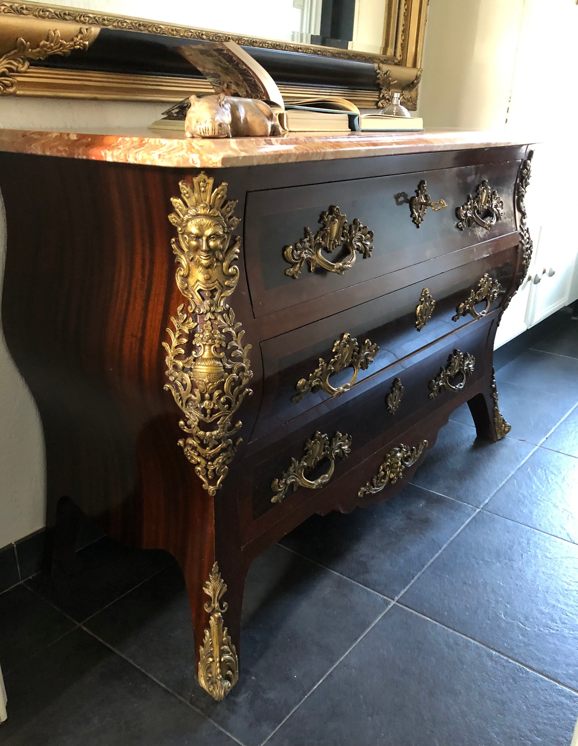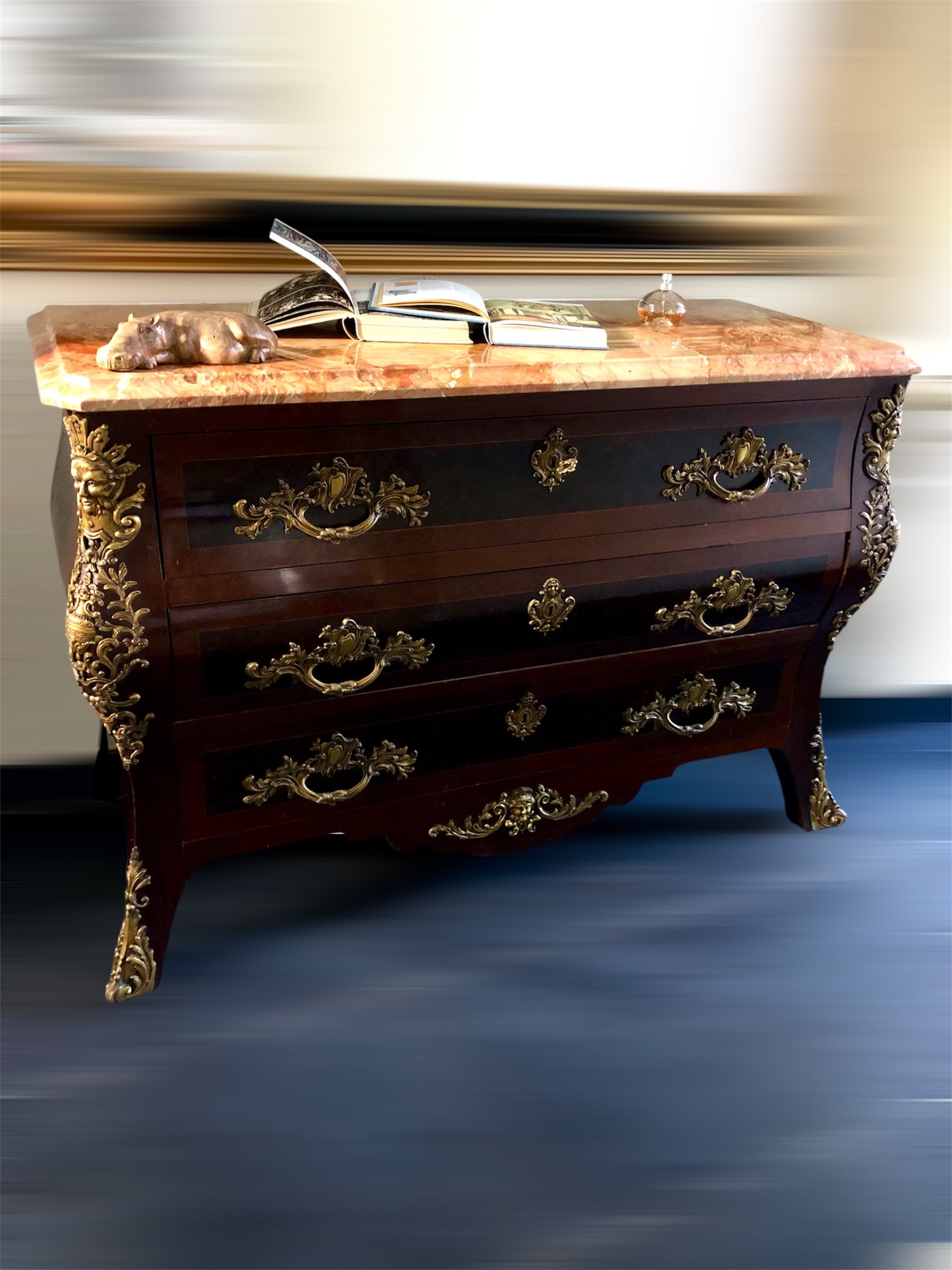 Commode Louis XV-stijl .Notelaren gegalbeerde drielandecommode met bronsbeslag, mazarinkoppen opzij en marmeren blad. France 1940. H90 / B130 /D 52