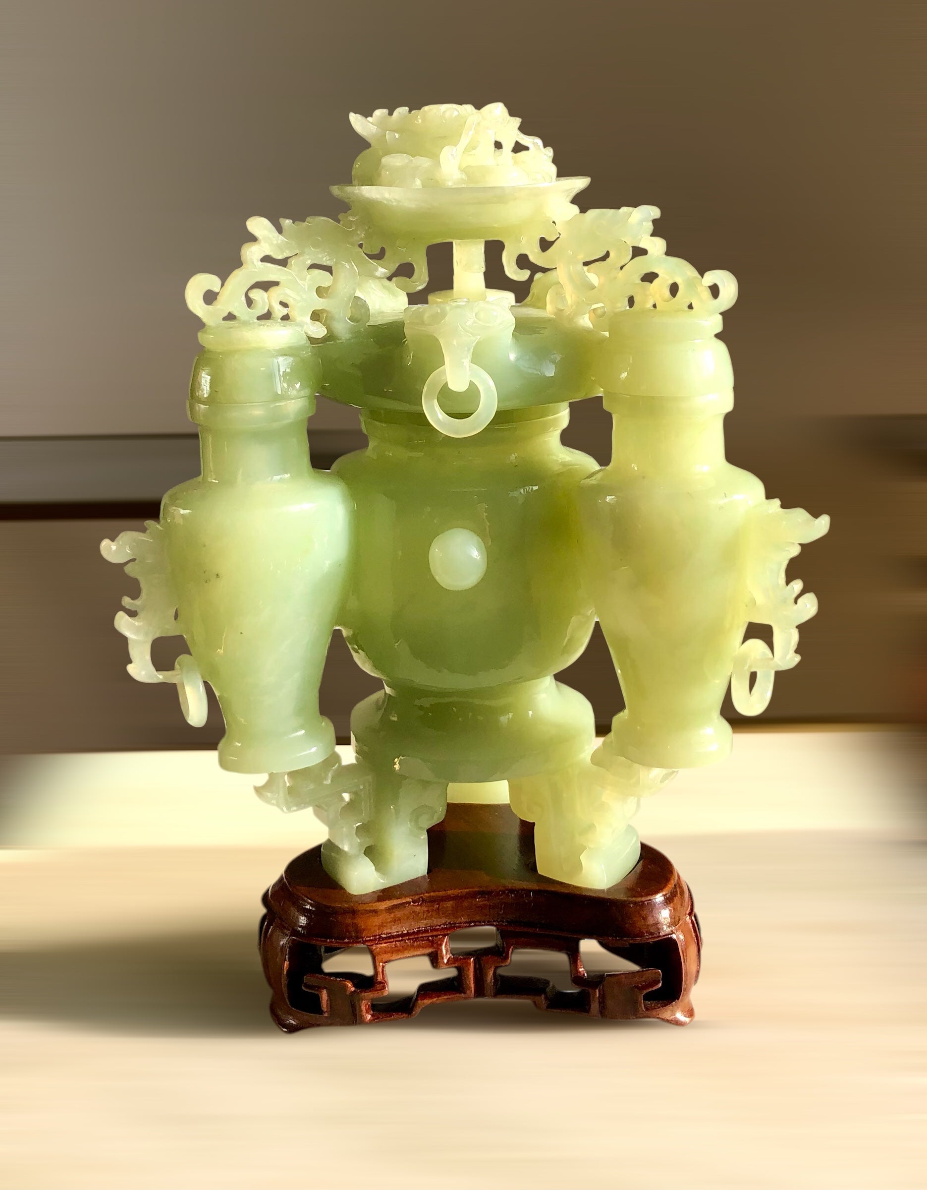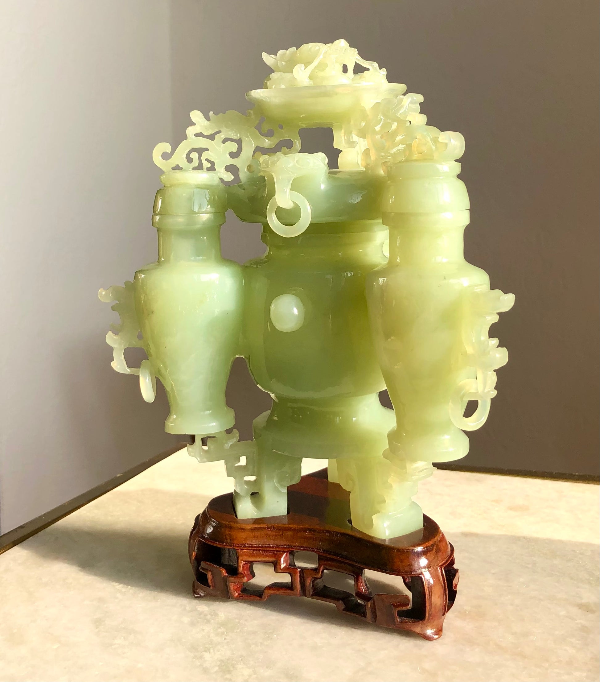 A CHINESE CELADON JADE 'DRAGON' INCENSE BURNER AND COVER. 20th Century. 21x16