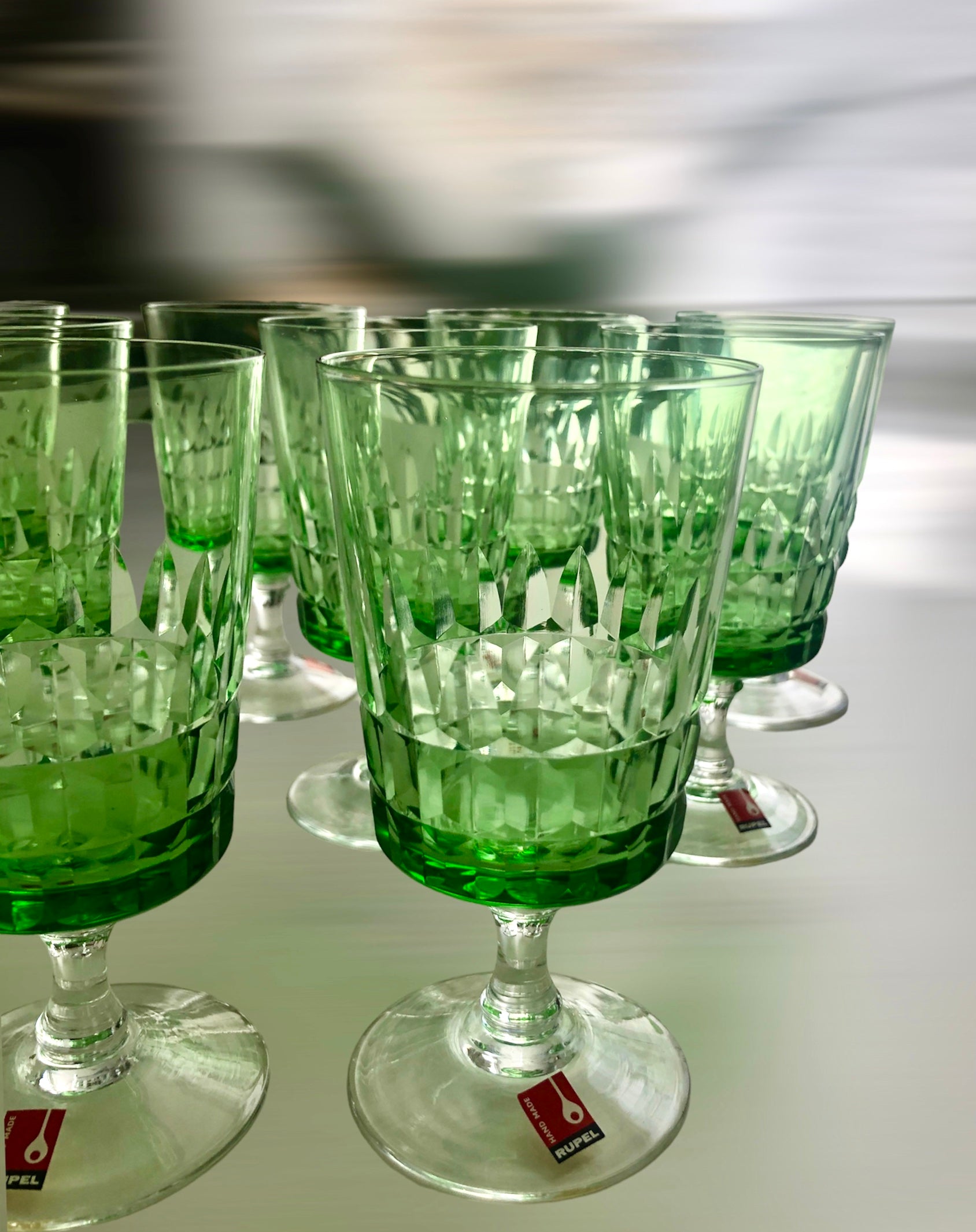 Vintage Kristallen glazen set Rupel Boom - 12 glazen. Gemaakt in België in de glasfabriek "De Rupel" in Boom. Mooie groene kleur, handgemaakt met het originele label Aantal glazen: 12 /H12,5 /D6, nieuwstaat