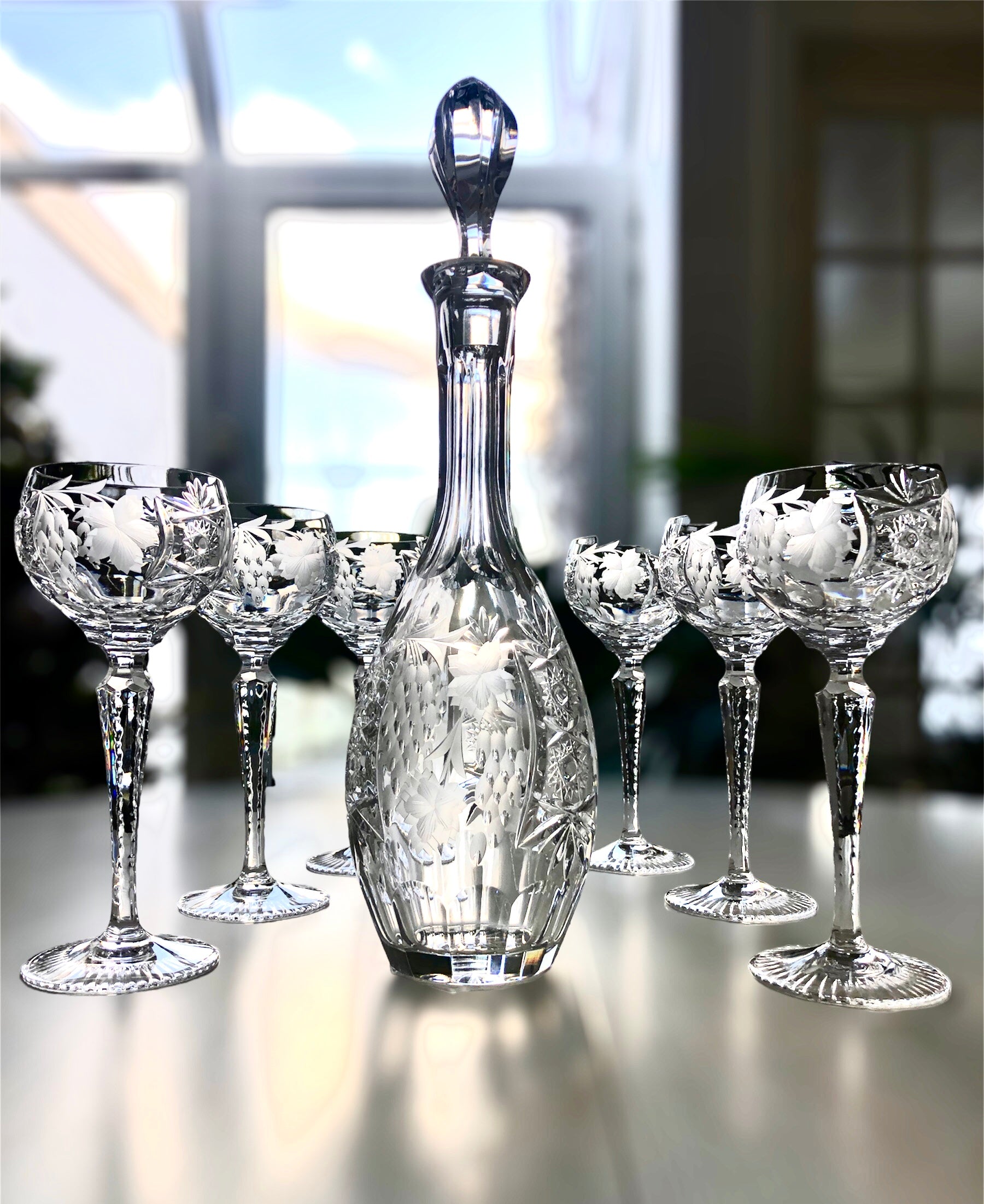 Kristallen karaf met druivendecor is met de hand gesneden en met de hand gepolijst. Ongelooflijke kwaliteit en ontwerp. De karaf is zwaar, van hoge kwaliteit en heeft een prachtig ontwerp. Een blikvanger in elke bar. HOOGTE (met de stop): 39 cm (15,35'') HOOGTE (zonder de stop): 30 cm (11,81'') GEWICHT: 1550 g (3,42 lbs)