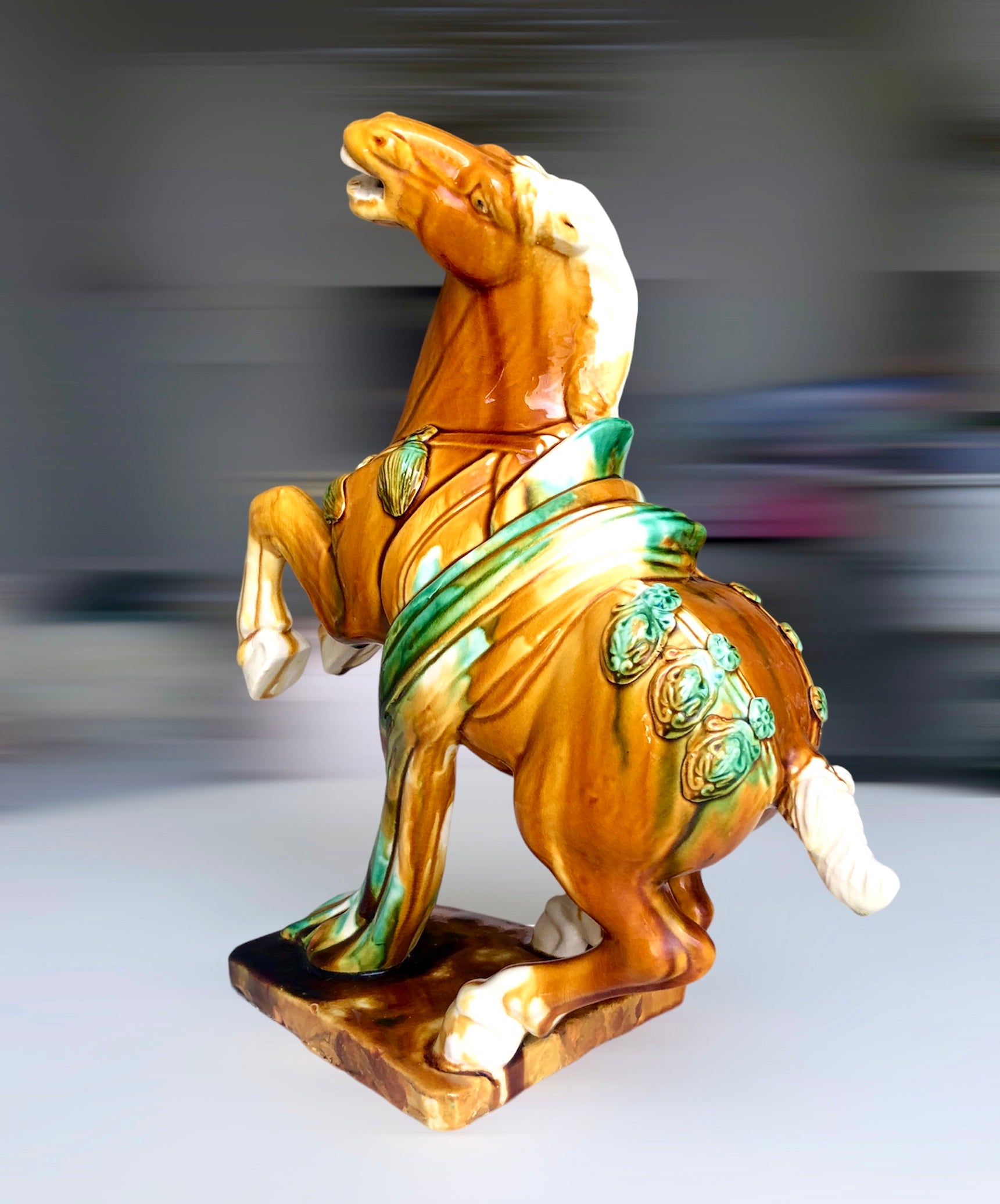Chinese Tang paard, geglazuurd terracotta beeld van een gezadeld paard. Fraaie bruine en groene glazuur gemaakt naar een voorbeeld van oude archeologische chinese pardenbeelden /H37 B31