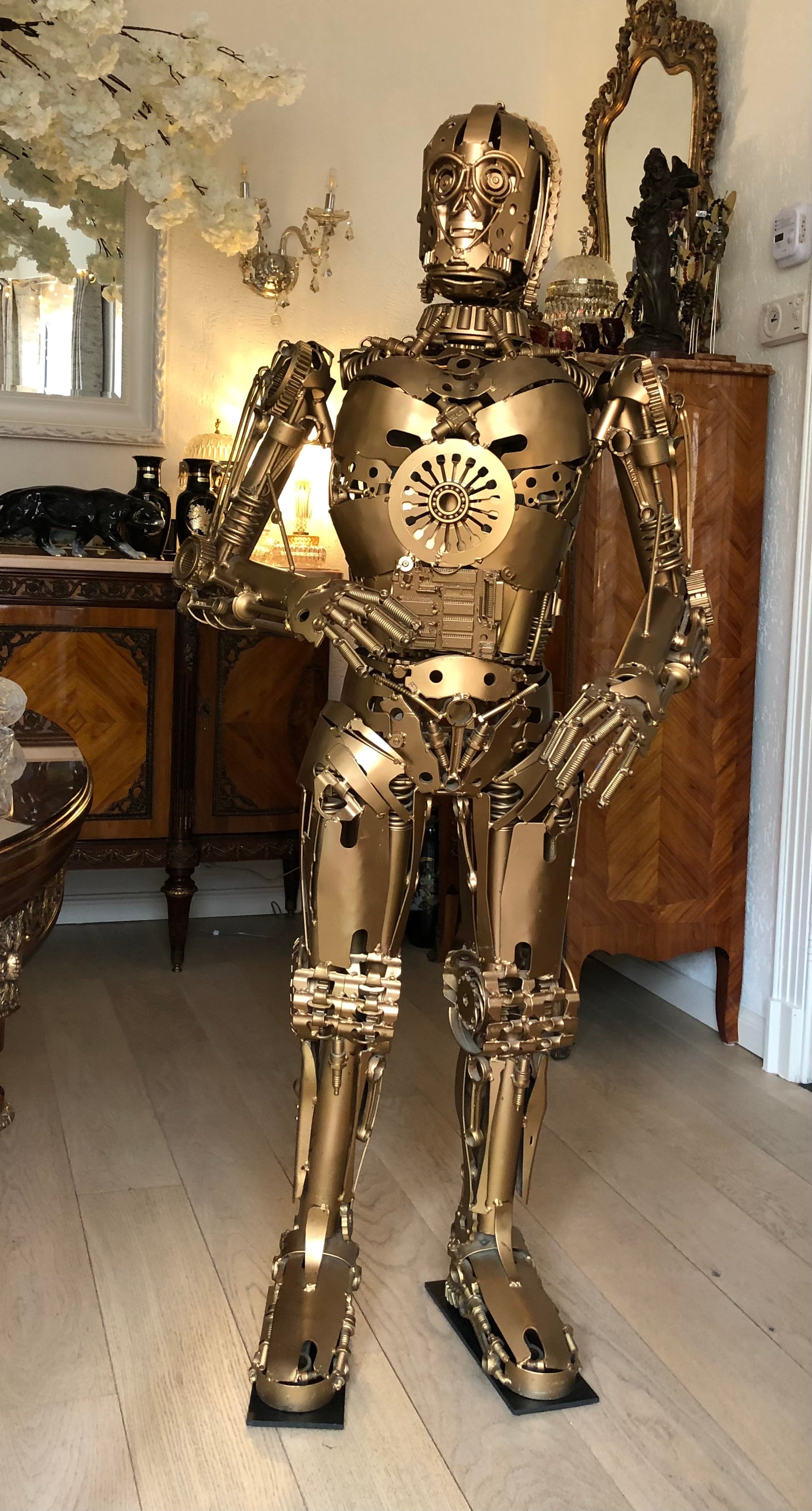 1/1 schaal op C3PO geïnspireerde robot van gerecyleerd metaal.