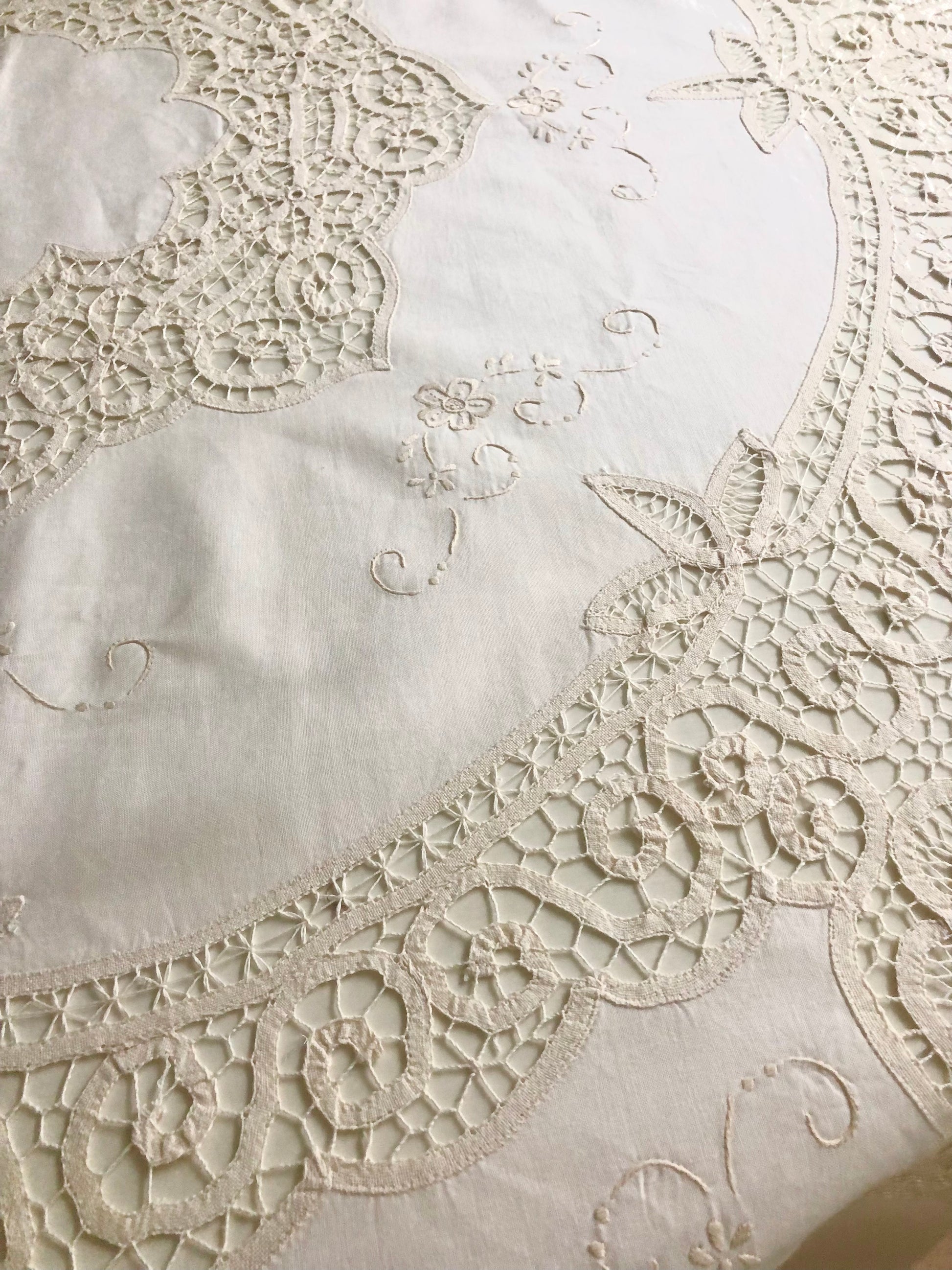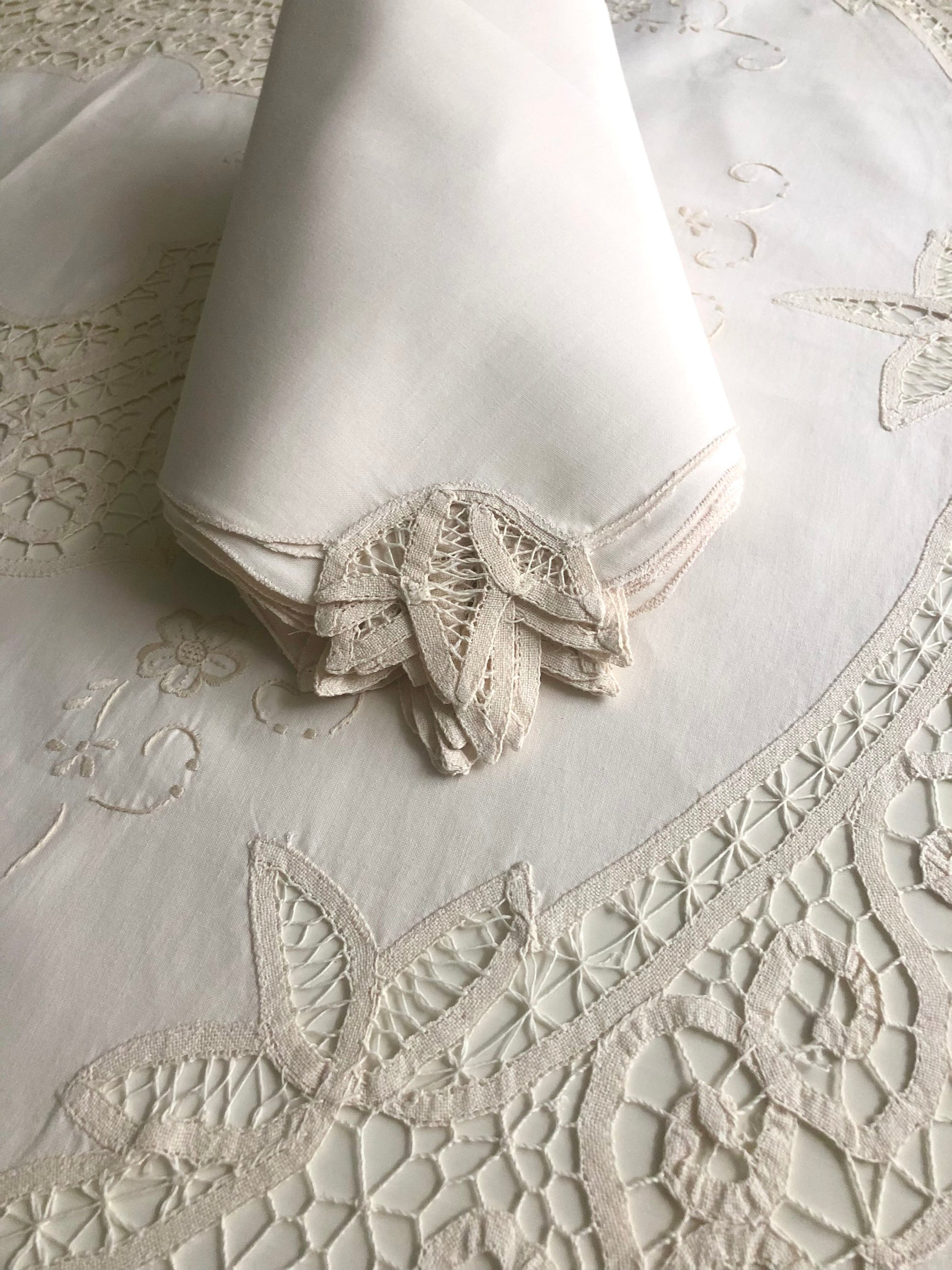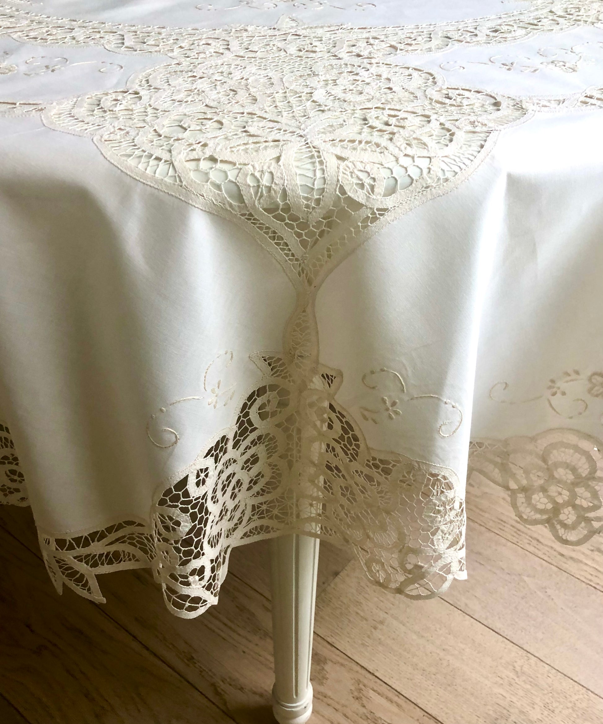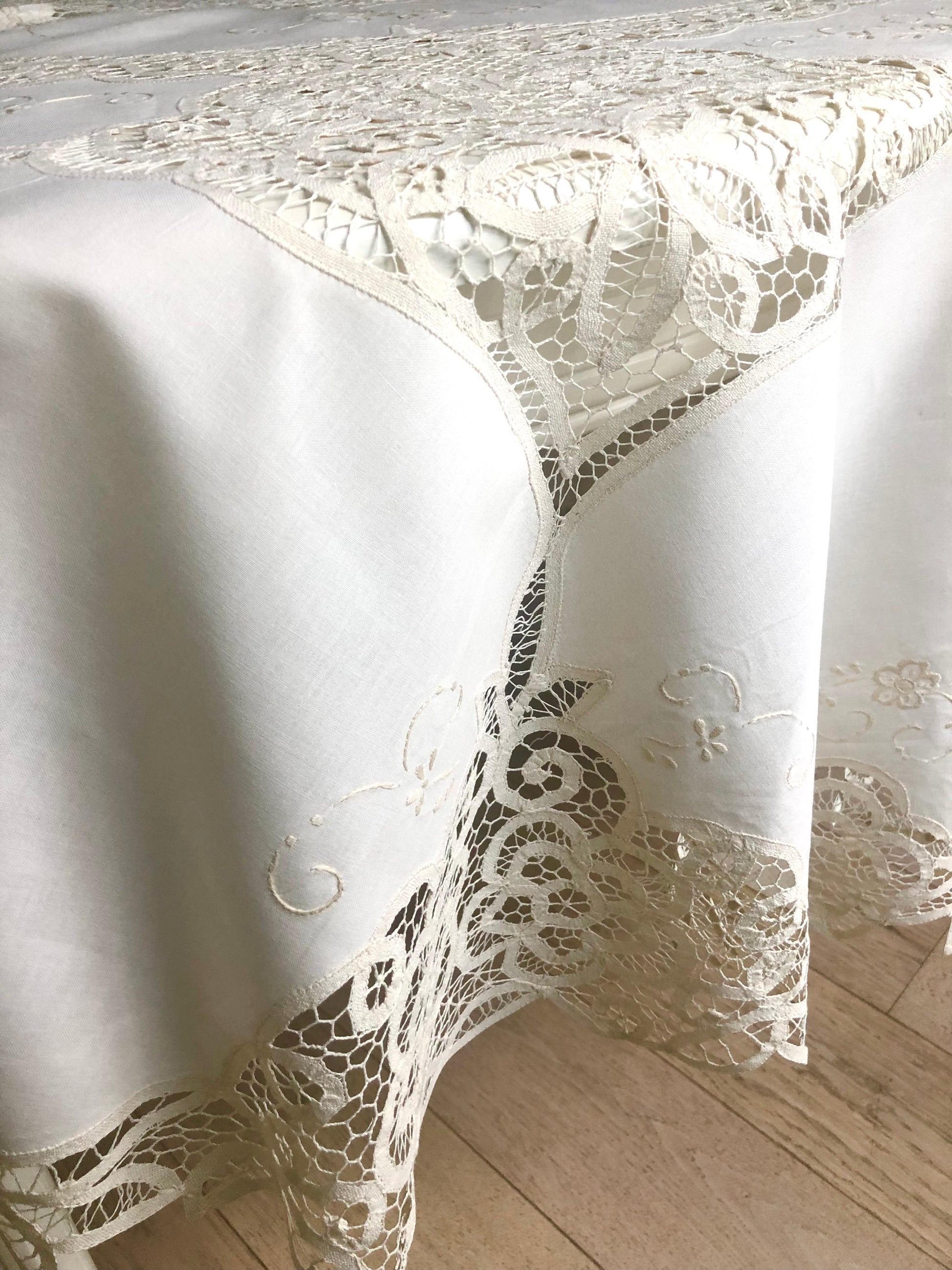 Tafelkleed, Brugse kant, handgemaakt / L 210 / B210 , 12 servetten ( 40x40)