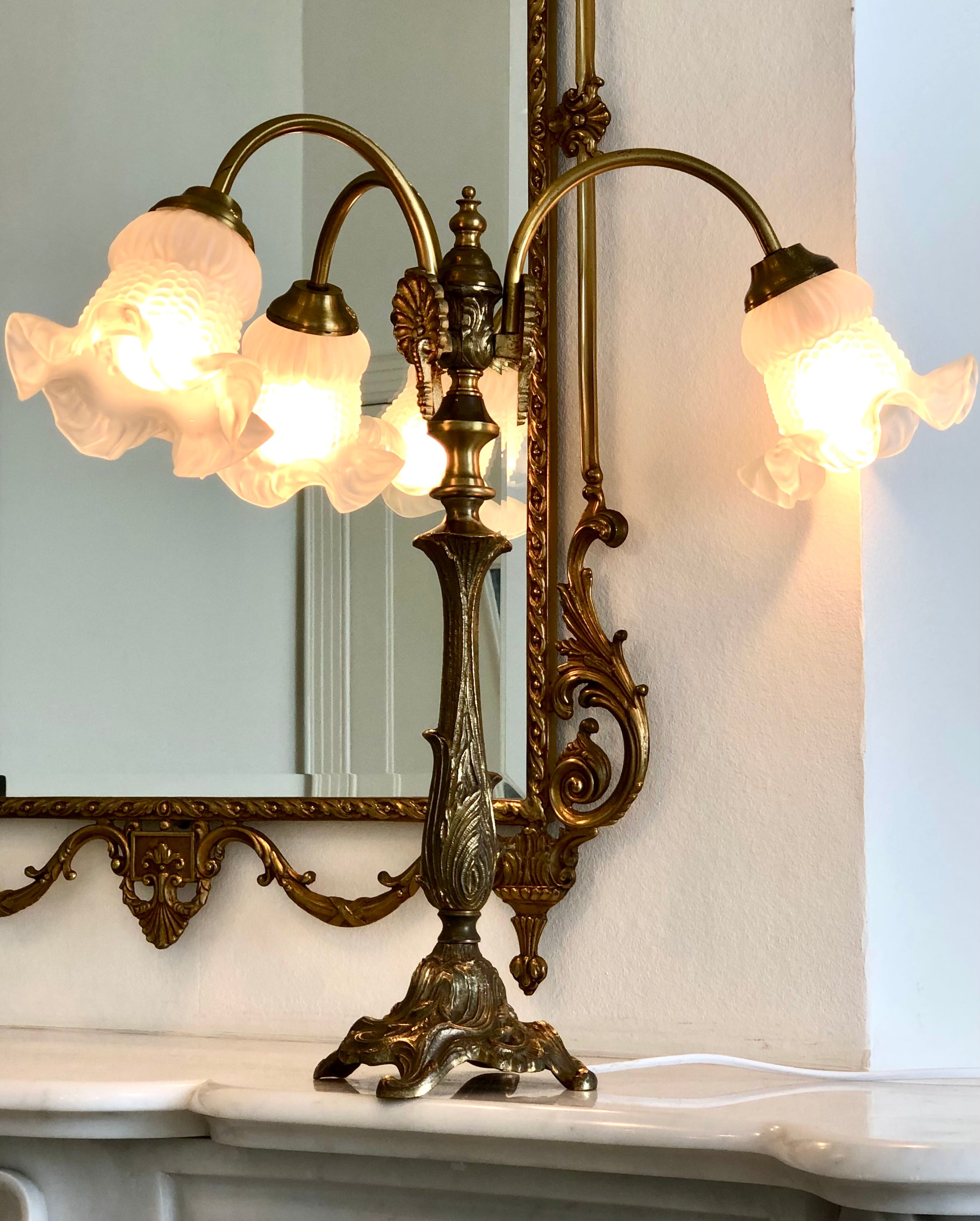Schitterende antiekeTafel- Sfeer- Bureau- Decorlamp met drie melkglazen kappen in de vorm van een bloem.