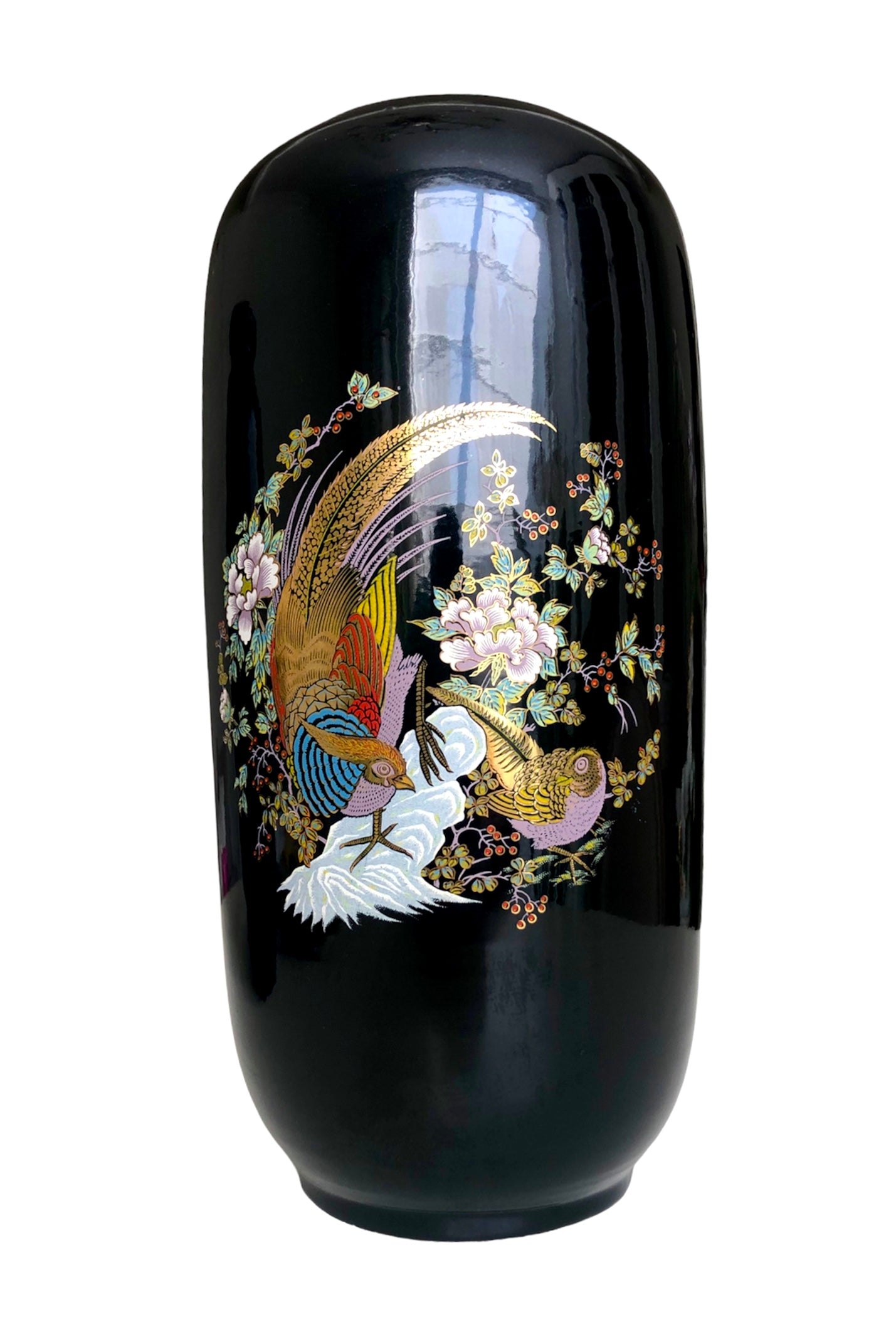 Tall black Japanese ceramic vase. Dark background allows the vibrant colors of the pheasant to really pop. Excellent decor in its own , It perfect vessel for summer flowers.